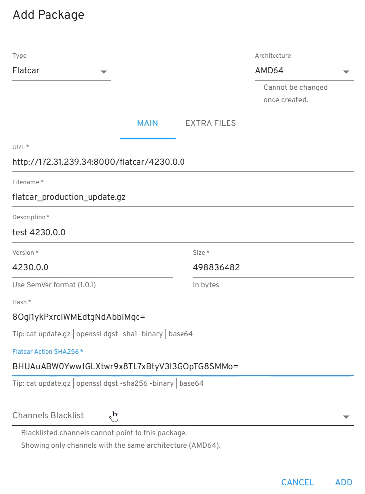 Nebraska is able to periodically poll the public Flatcar Container Linux update servers and create new packages to update the corresponding channels. So if Nebraska is connected to the internet, new packages will show up automatically for the official Flatcar Container Linux. This functionality is optional, and turned off by default. If you